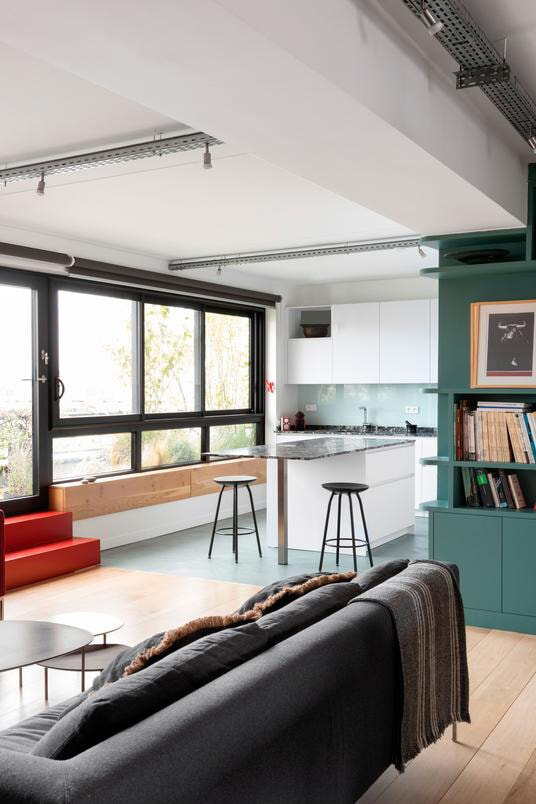 インテリア設計スタジオUn Jour d’Avrilのクリステル・ラポルトの手によって、ブローニュにある建物の最上階のオフィスが、アットホームな雰囲気のロフト風アパルトマンに生まれ変わった。