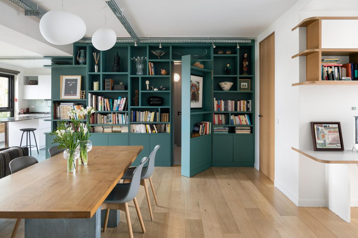 アフター:隠し扉のある本棚。扉の奥はゲスト用トイレと浴室。photography: Gabrielle Voinot