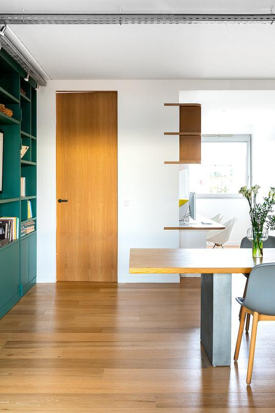 アフター:リビングから見たメインベッドルームに通じる木製の扉。寝室の壁に沿って、開放的で機能的なワークスペースを設けた。デスク周りの家具は造り付け。photography: Gabrielle Voinot