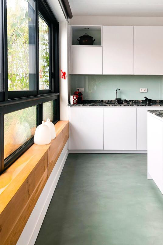 「先ほど言ったように、排水管スペースが一箇所しかなかったので、キッチンと浴室を設置できる場所は限られていました。それ以外の場所に設けるとなると、大工事をしなければなりませんでした。キッチンはリビングの一番奥にあり、応接スペースに隣接しています。床には若干青みがかった色合いの防水コンクリートを敷きました。キッチンには間仕切りを設けなかったので、フローリングと質感の違う床材を用いて、視覚的にキッチンスペースを区切る方法を採りました。キッチンの床は本棚の色と同系色。このキッチンスペースに和やかな雰囲気を作り出すために、窓に沿ってボックスを設置し、そこに木製のベンチを設えました。とてもシンプルなキッチンに温かみが加わりました。プレーンな仕上がりにしたのは、存在感のある本棚とのバランスを考えてのこと。ひとつの空間に強い要素がふたつあるのは望ましくないと思ったのです。キッチンの各要素のデザインはかなり控えめですが、とても機能的な作りになっています。たとえばキッチンの右側には、小さな食品庫に通じる扉もあります」