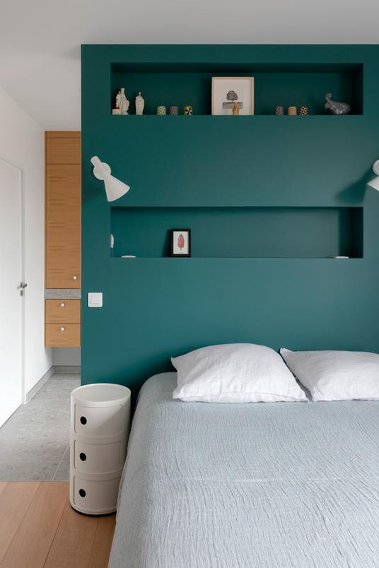 アフター:寝室。造り付けのヘッドボードは浴室と隔てる壁の役割も果たしている。photography: Gabrielle Voinot