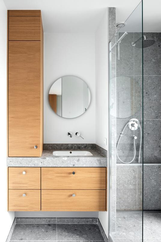 「主寝室には本棚の右側にある扉から入ります。ヘッドボードは造り付けで、寝室と浴室を隔てる仕切りでもあります。左側は開放して、浴室とゆるくつながる間取りになっています。ここでも床が空間を区切る役割を果たしています。寝室はフローリングで、浴室はテラゾー仕上げを用いています。浴室はシンメトリックなレイアウト。寝室から木製の洗面台と洗面ボウルが見えますが、まったく同じ作りの洗面台が右側、つまり反対側の窓際にもあります。このふたつのエレメントに挟まれて、浴室の中心に、全面ガラス張りのシャワールームがあります。透明感を重視したデザインで、両側からアクセスできます。クライアントは上質でシンプルな天然素材を使いたいと強く希望していました」