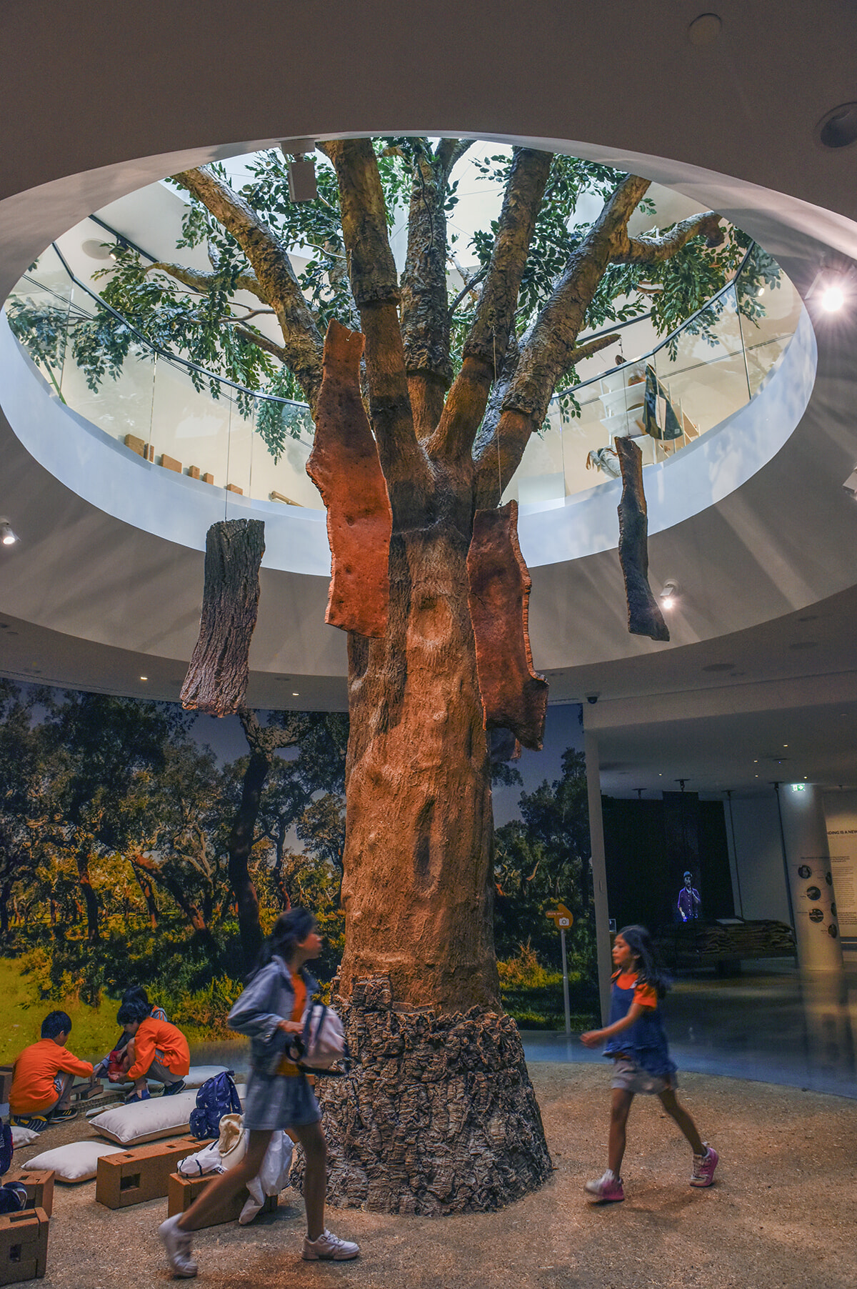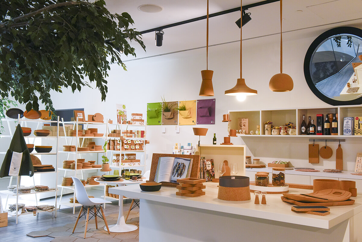 入場するとコルクの巨大ツリーが! コルクの生産工程や歴史について学べる。コルクで作られた靴や服、雑貨類などお土産が手に入るミュージアムショップも。