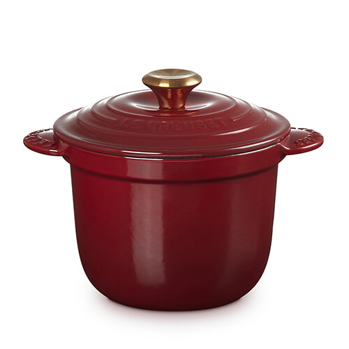 日本人のライフスタイルに合わせ、フランスの職人とともに開発。底の角を丸くすることで熱の対流が効率化するよう設計されている。深さがあるので、少量の揚げ物やパン作りにもおすすめだ。煮物や炊飯時の吹きこぼれを防ぐには、別売りのインナーリッド(内蓋)が便利。●サイズ18 直径18cm(取手込23cm)、高さ17cm(蓋込み) ¥28,600