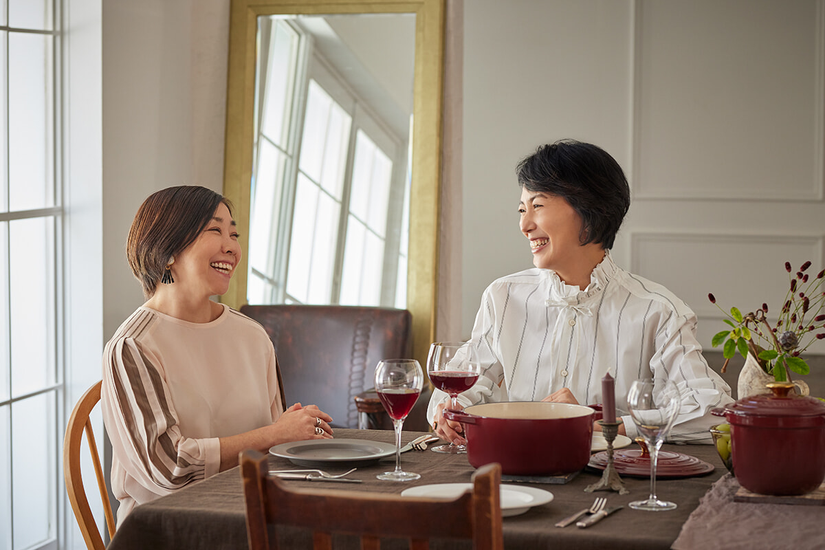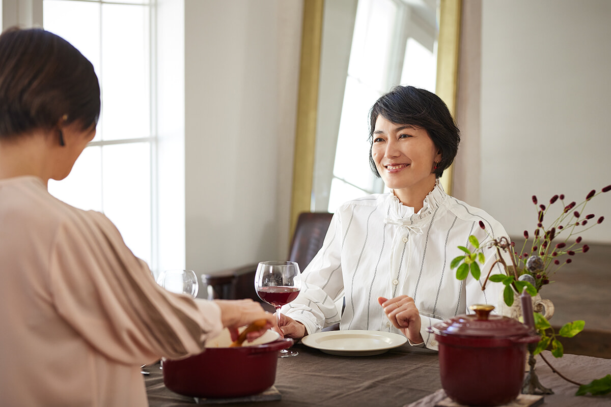 1925年に、北フランスの小さな村で誕生したル・クルーゼ。艶やかなエナメルでコーディングされた鋳物ホーロー鍋は、今日にいたるまで職人の手でひとつひとつ大切に作られている。そんなル・クルーゼから、南仏を代表するワインの産地の名を冠した新コレクション「ローヌ」が登場。芳醇な味わいのローヌ産ワインのように、しっとりとした存在感を放つこの新色にふさわしいレシピを、料理家・平野由希子さんが考案。女優の板谷由夏さんをゲストに迎え、お料理をいただきながらル・クルーゼの魅力やおもてなしの極意について語り合ってもらった。