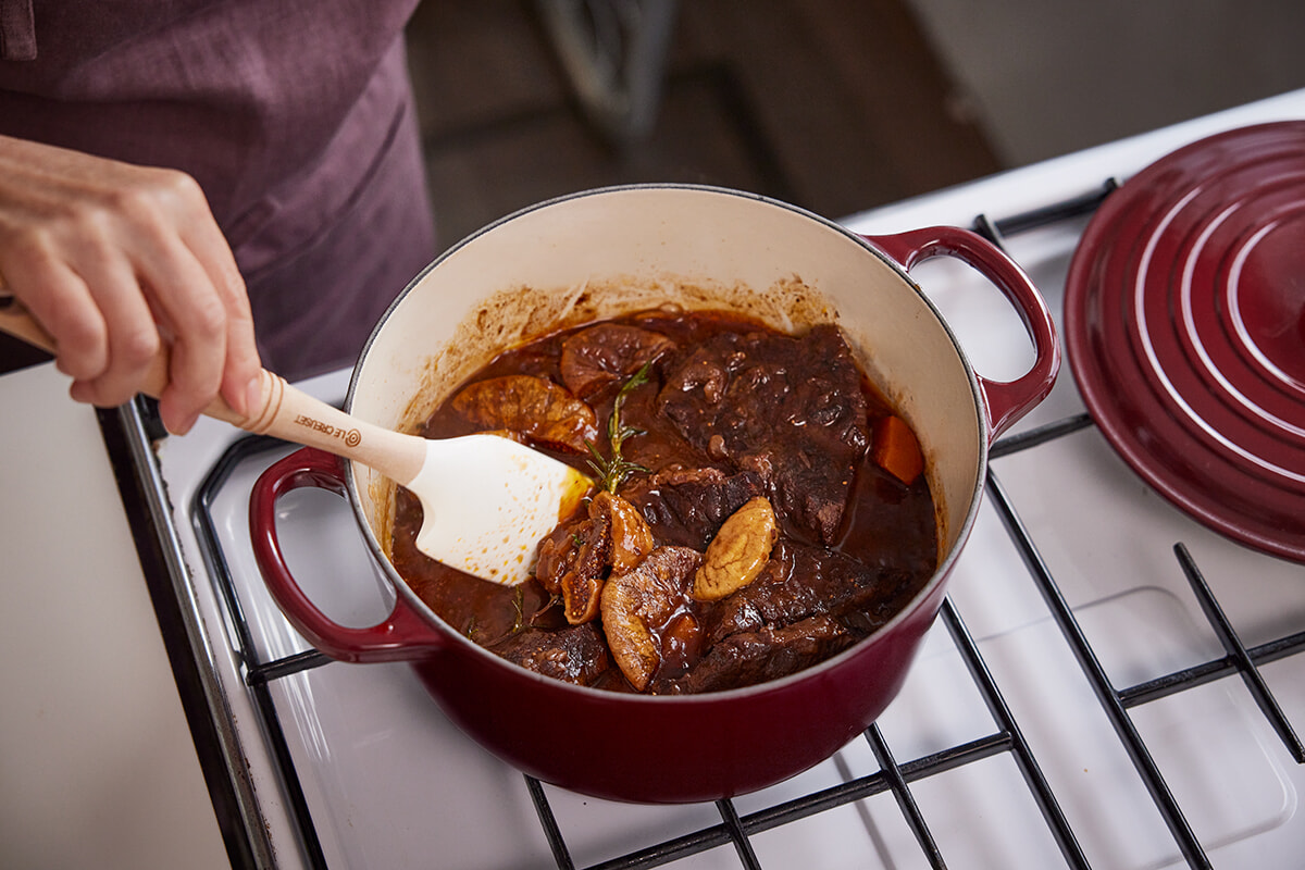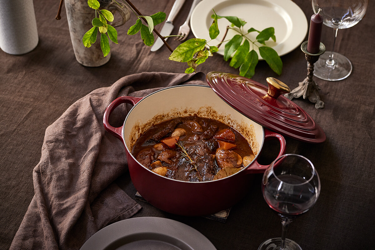 「シグニチャー ココット・ロンド」を使用して、牛のすね肉を赤ワインとともにじっくり煮込む一品。ル・クルーゼの鍋なら、テクニックいらずでほろほろとしたやわらかいお肉に(牛肉以外にも、豚の肩肉や鶏肉を代用するのもおすすめ)。また、赤ワインの酸味が強く出ないように、干しイチジクとはちみつを加えるのが滋味深く仕上げるコツ。