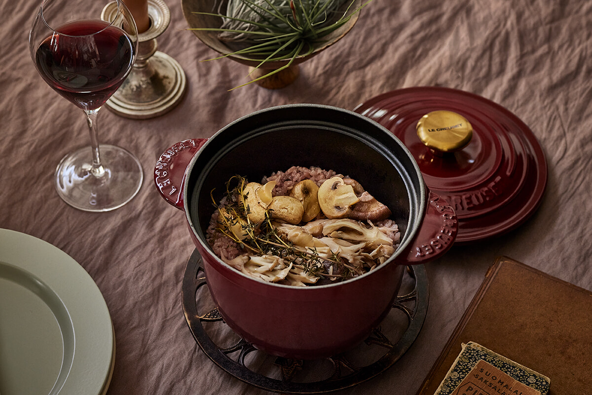 「ココット・エブリィ」を使い、キノコと鶏肉の出汁で炊き上げたピラフは、赤ワインを加えることで、お米のひと粒ひと粒がモチモチに。米のおいしさを最大限に引き出せるのは、ご飯を日常的に炊く日本人のライフスタイルに特化した鍋だからこそ。味付けは最小限にして、素材の旨味をたっぷり味わいたい。