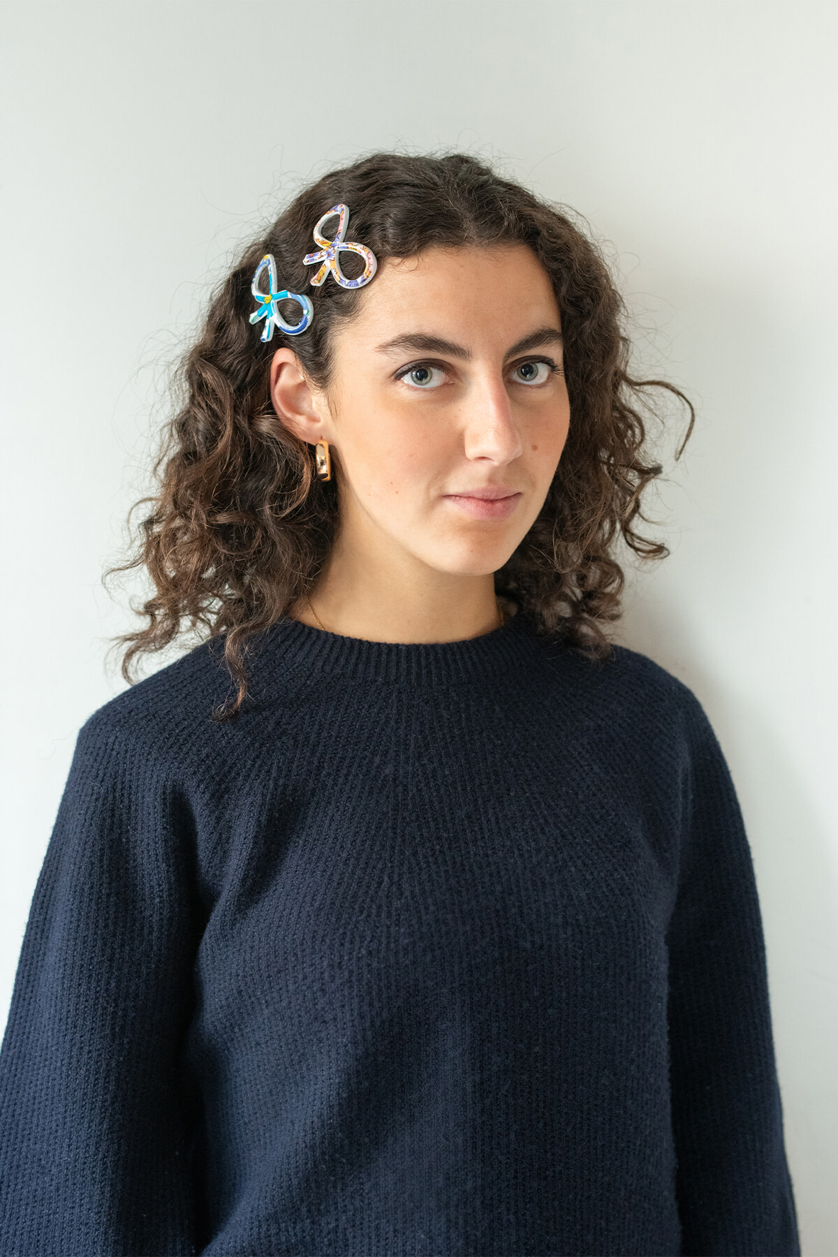 右/クロチルドは、リボンのバレッタを襟元に着けて、ネイビーのベーシックなニットのアクセントに。