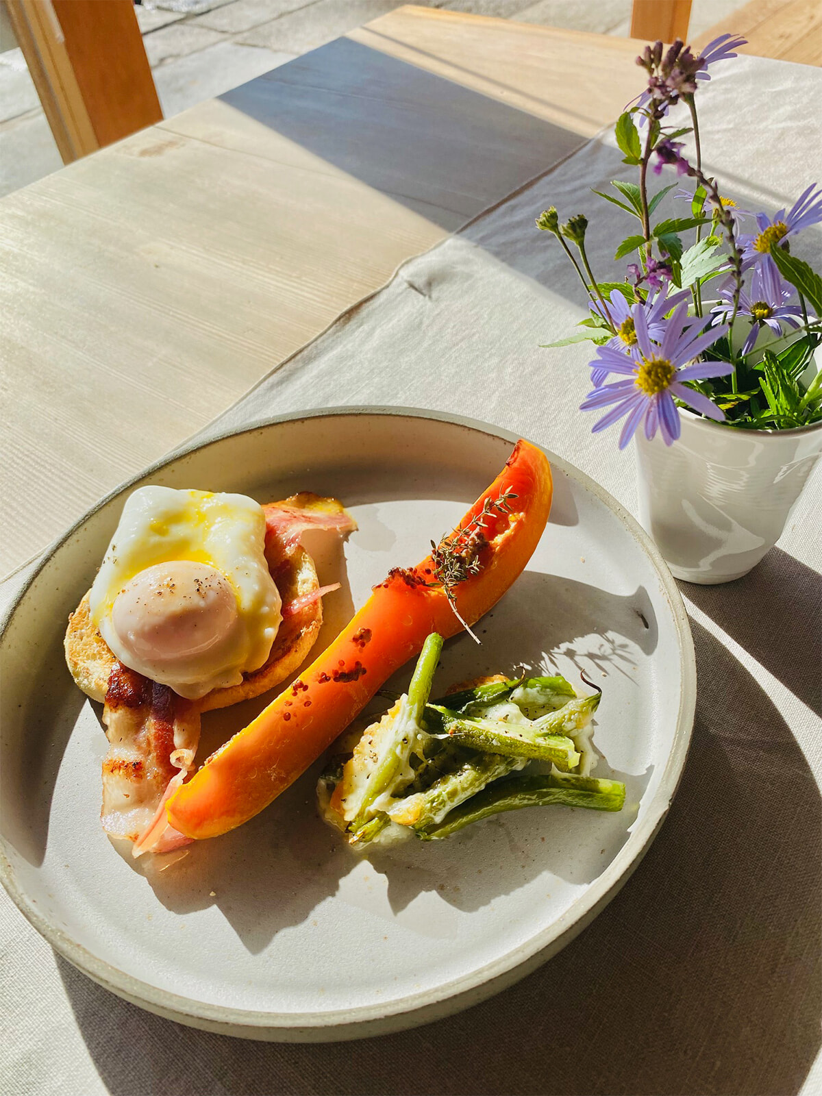 朝食のひと皿。須田さんこだわりのエッグベネディクトは、新鮮有機野菜とともに。