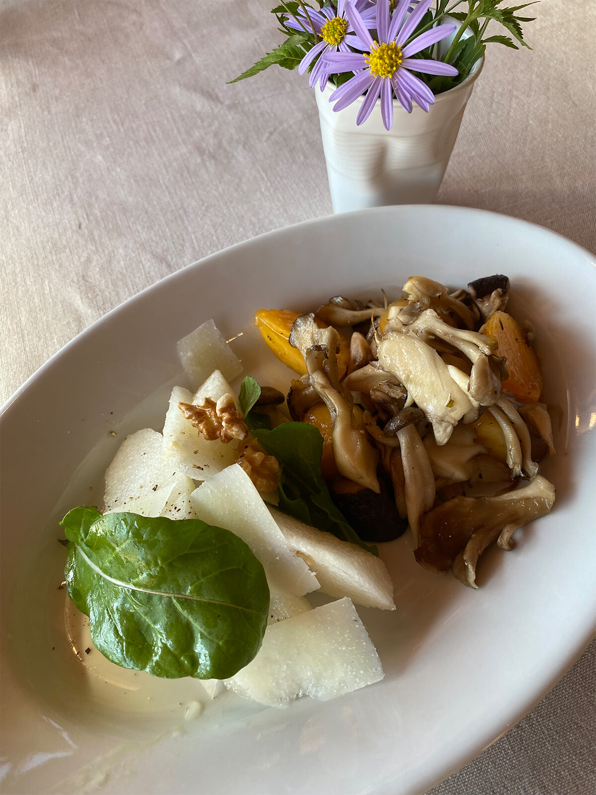 こちらも朝食のひと皿で、柿ときのこのマリネに、梨とルッコラ、胡桃のサラダ。どれもみずみずしい素材の味を活かした記憶に残るもの。