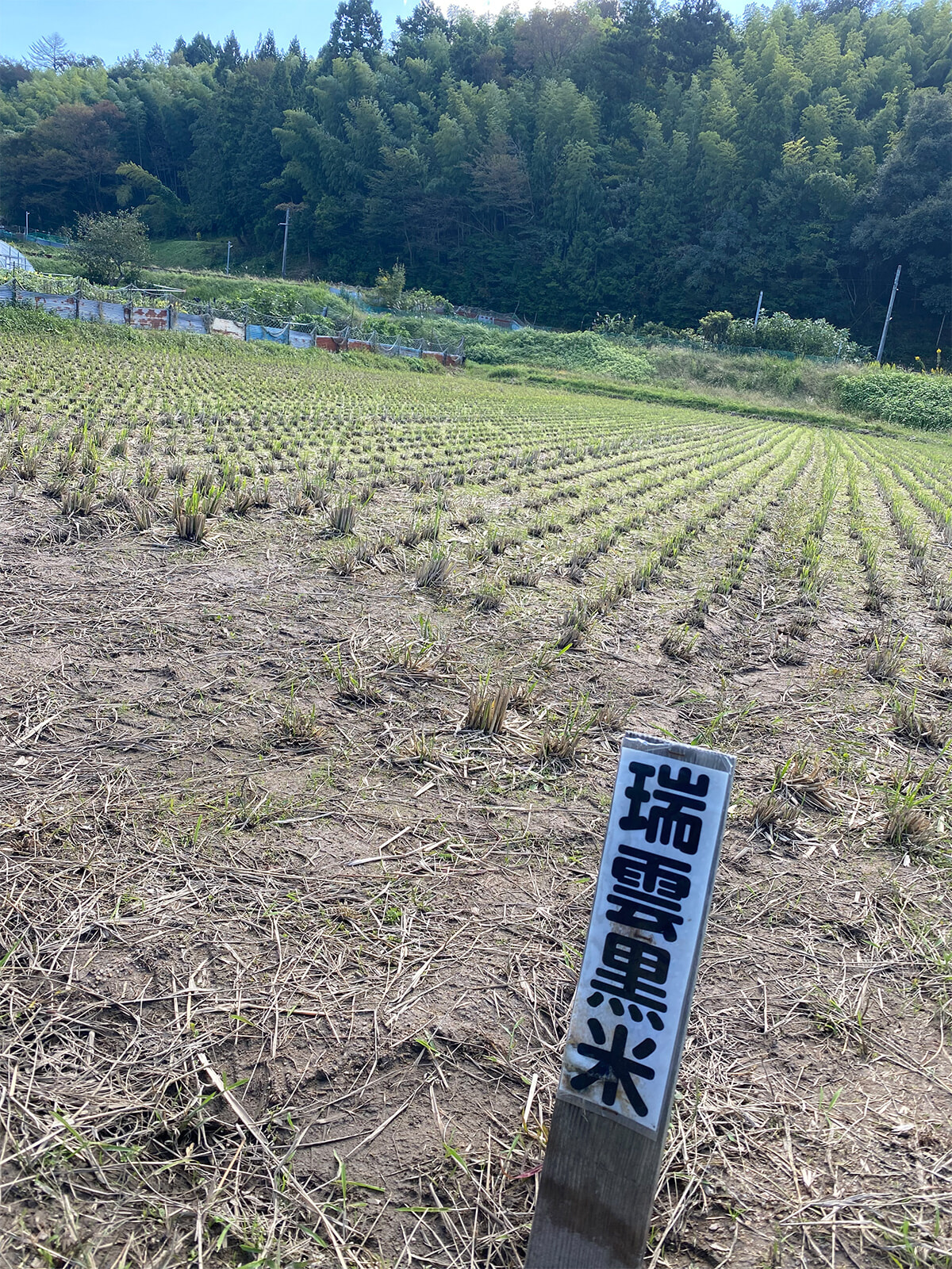 稲刈り直後の希少米、瑞泉黒米の田んぼ。瑞泉黒米から抽出した成分の力を発酵によって開花させ、配合した化粧品「FAS」が、注目を集めている。