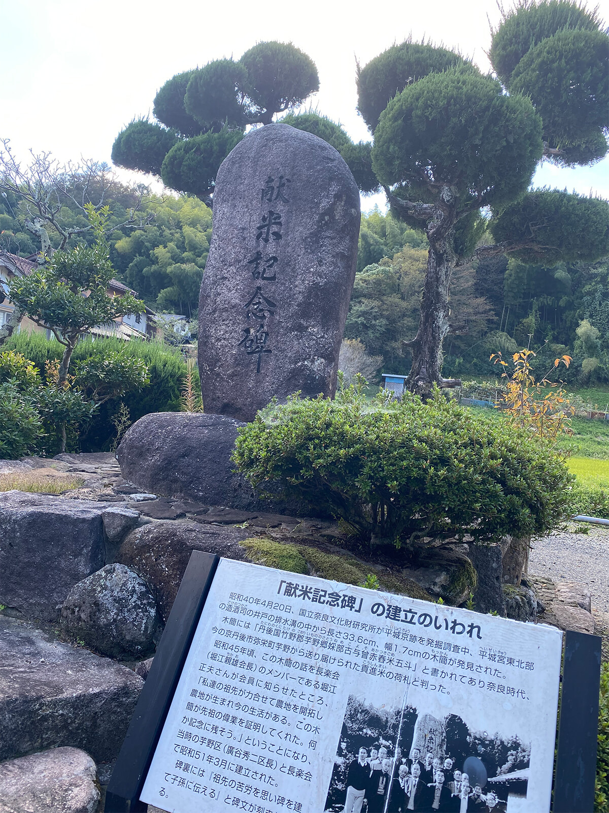 平城京跡から発掘された木簡に、丹後国武野郡芋野から献上された貢進米の記録が。芋野郷へは、米栽培の歴史を刻む記念碑を目安に。