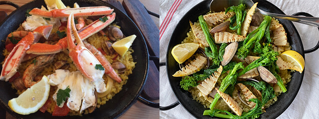 豊富な魚介類をふんだんに使ったパエリアが絶品で、この味を求めて通い続けるリピーターも多い。季節によって松葉ガニ(写真左)、ハマグリ(写真右)など、具材が変わるのも楽しみ。