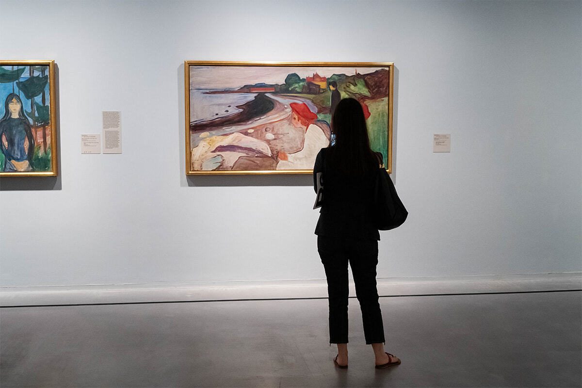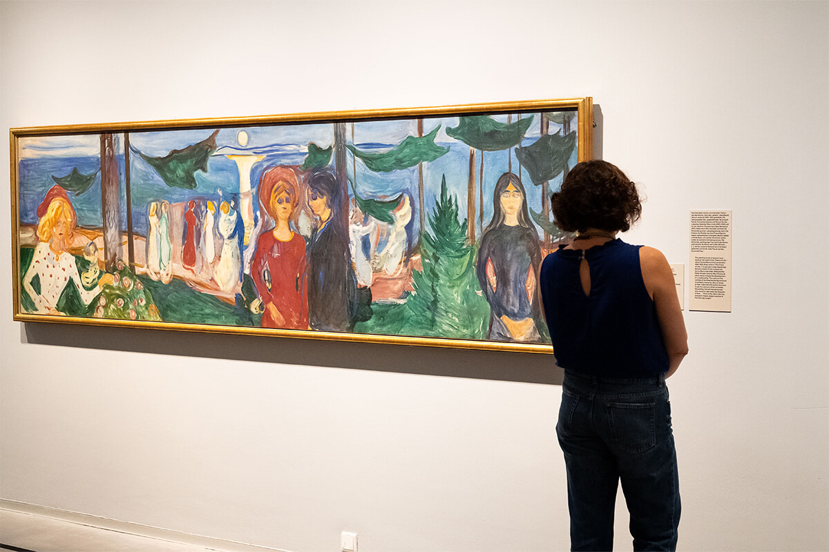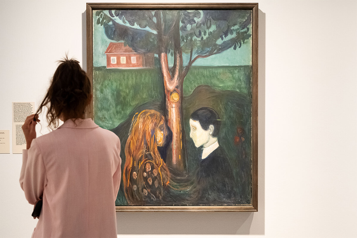 「生命のフリーズ」の一部となった『ビーチでの踊り』。ムンクはしばしば3人の女性を作品に登場させている。白いワンピースの若い女性、真っ赤なドレスの成熟した女性、そして喪服姿にも見える黒づくめの女性。それぞれ、女性に対する男性の3つの視点を表しているとも。photography: © Harry Schnitge