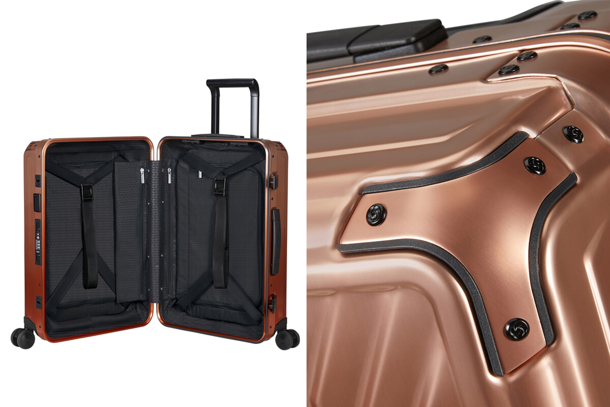 「ライトボックス アル」は、マットに輝くアルミニウムの本体に、耐食性や表面硬度を向上させるための陽極酸化処理が施されているのが特徴。強度も高める立体的なリブデザインに、外観のアクセントとしても機能している外部からの衝撃を緩和するコーナープロテクターのそれぞれが、高級感のある佇まいを完成させている。アルミ製のスーツケースは、その丈夫さだけでなく、旅を重ねるごとに自然な味わいが増していき、微かな傷や汚れといった変化すら楽しむことができる唯一の素材ともいえる。