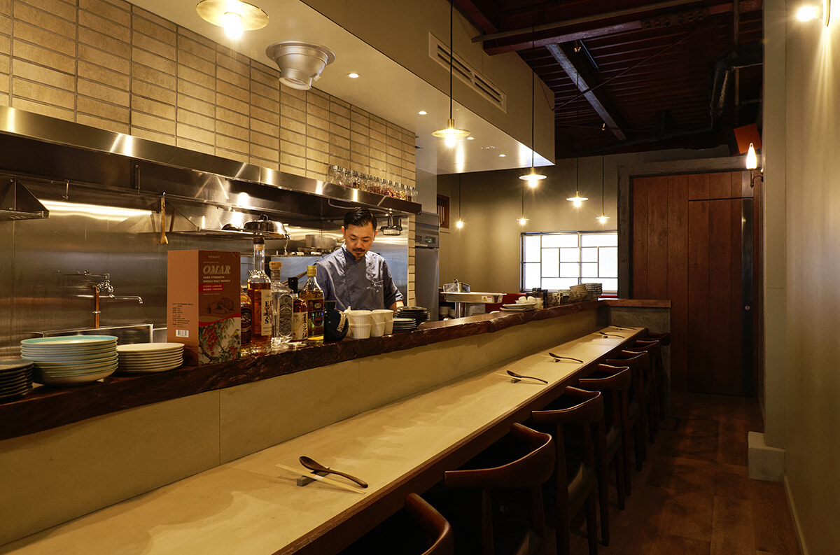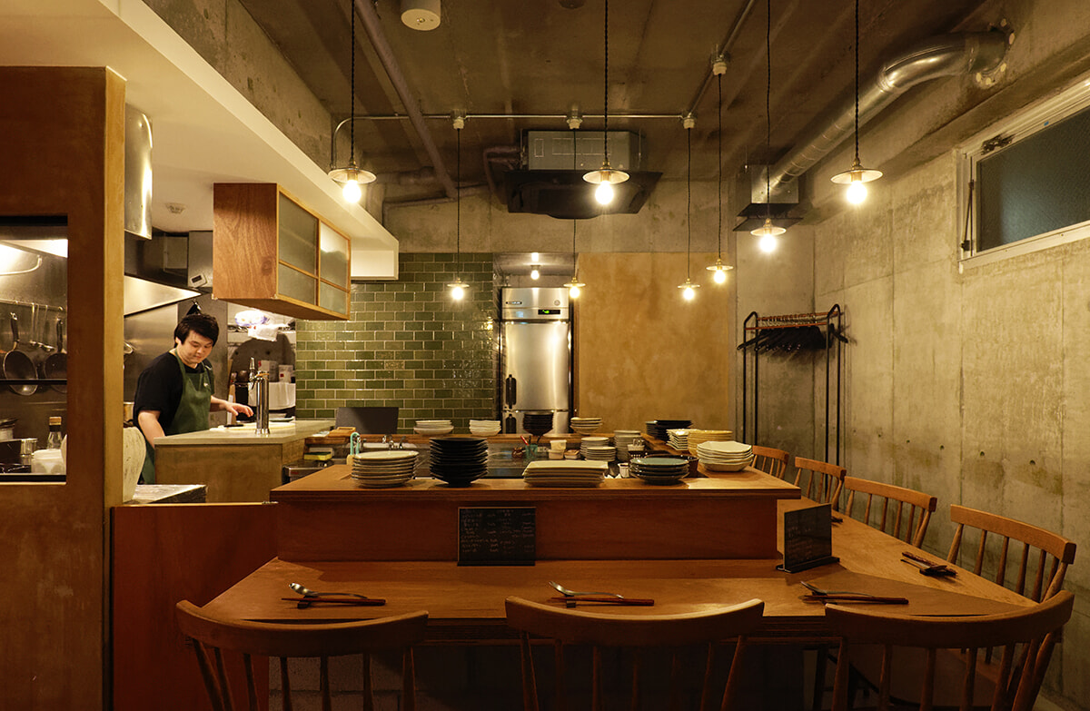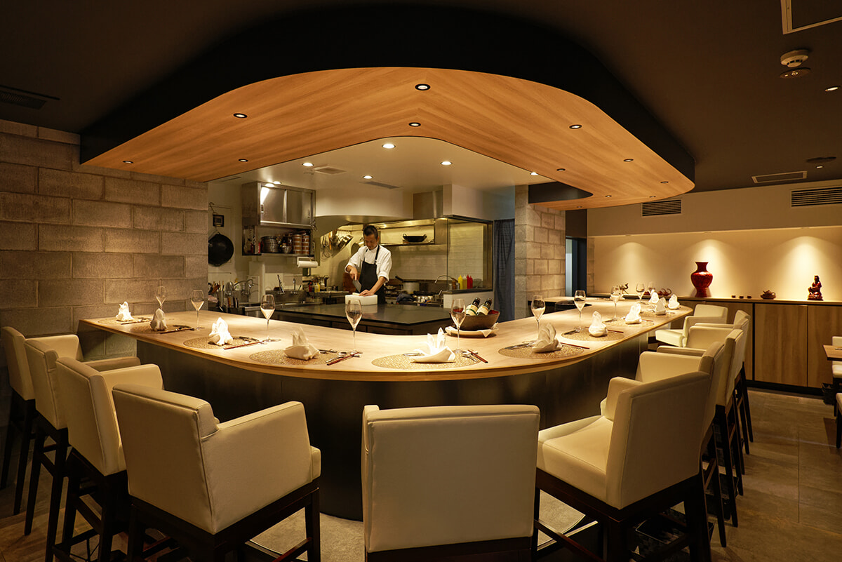 キッチンを囲むように設計されたカウンター。調理の音や香りに気分が高揚する。店奥には4名様のテーブル席も。
