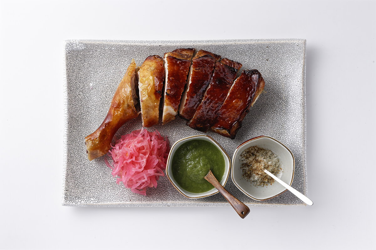 「赤鶏さつまの脆チョイ皮ペイ鶏カイ」¥1,600。香港版クリスピーチキンは塩、沙サー薑キョン粉ファン、五香粉で下味をつけてパリッとジューシーに焼き上げる。発酵唐辛子やパクチーで作る自家製ミントソースとの相性も抜群!