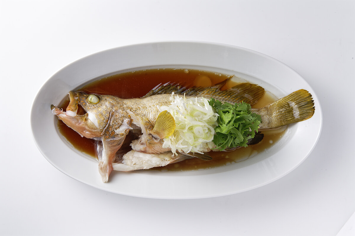 「香港鮮魚の蒸しもの」写真のサイズで¥6,000ほど。撮影時は長崎のアズキハタを使用。