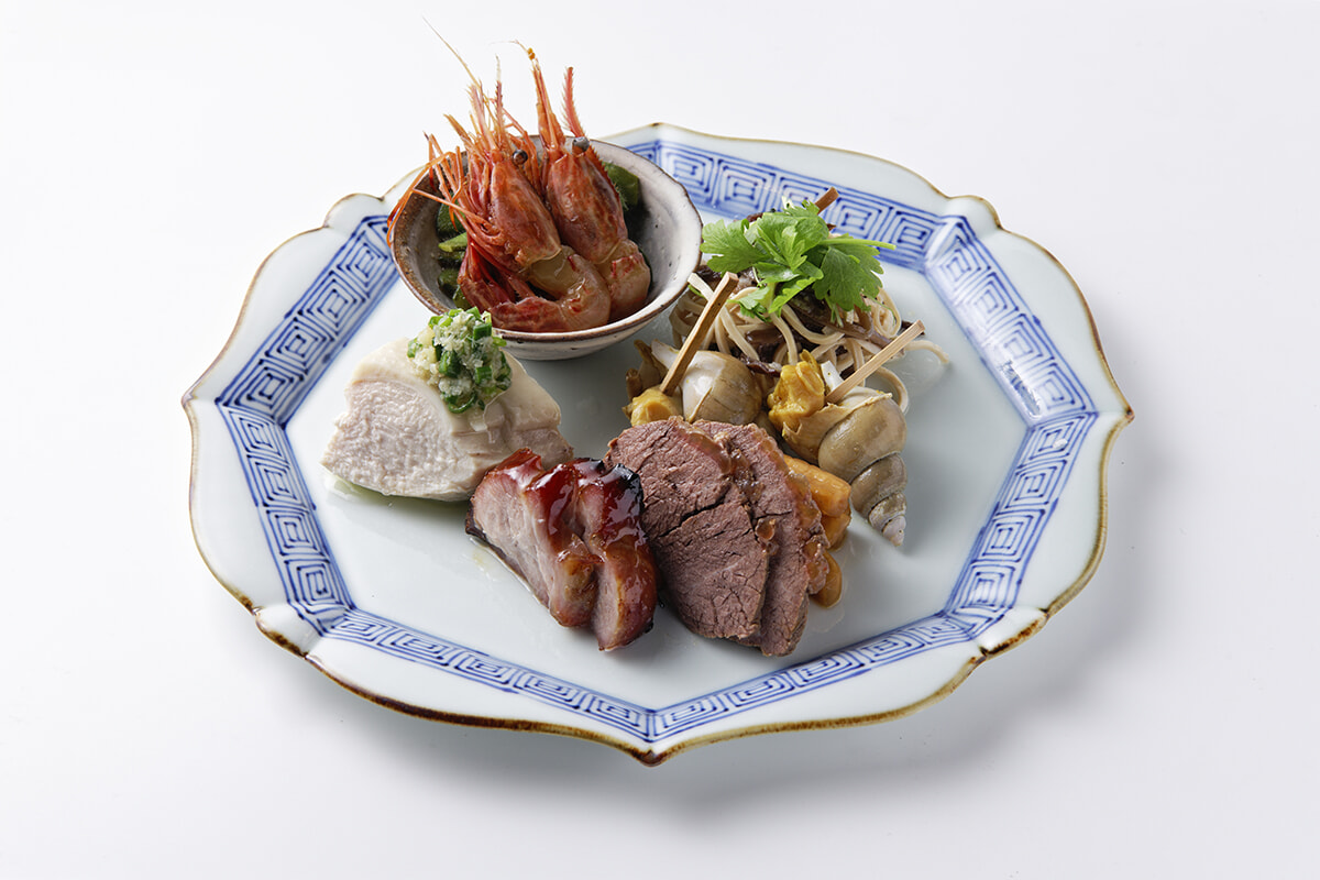 「おまかせ前菜5種盛り合わせ」1名分¥1,200〜。シマエビの紹興酒漬け、牛スネ辛味煮込み、蒸し鶏ネギショウガソースなど心が弾むラインナップ。