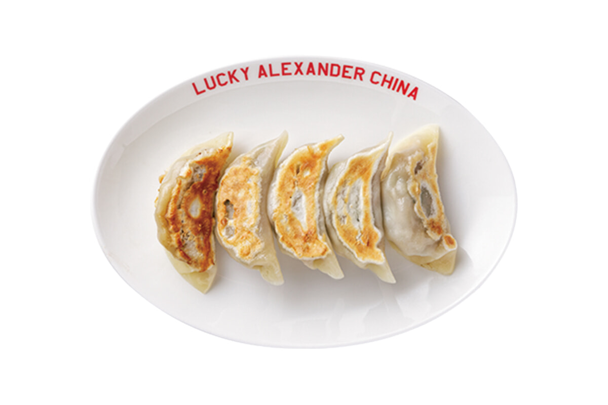 「豚肉餃子」(5個)¥660。手包みの餃子はニラ入り、ニンニクなし。豚、豚+ショウガ、ラム肉の3種の餃子を用意。皮はもっちり、餡はジューシィ。