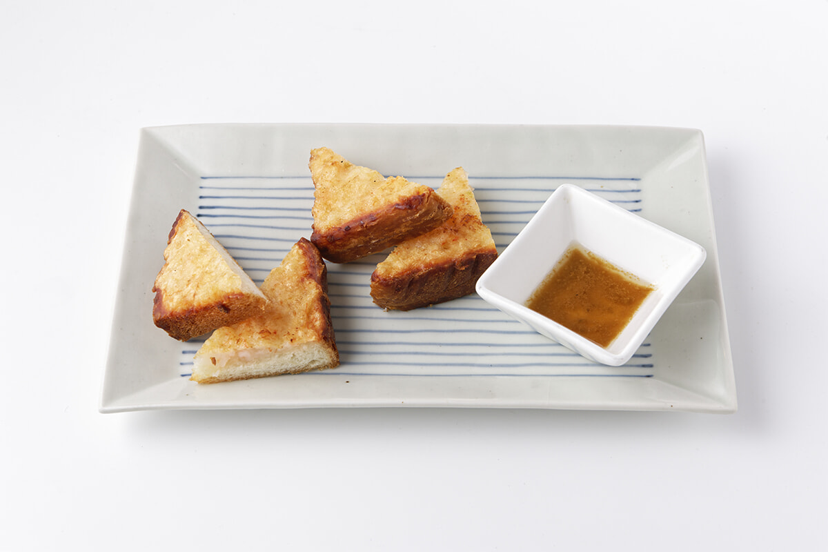 「エビトースト」¥800。エビのすり身をパンにたっぷりとのせてこんがりと焼いた人気の品。ワサビと醤油、太白ゴマ油、レモンを加えたタレにつけて味変を。