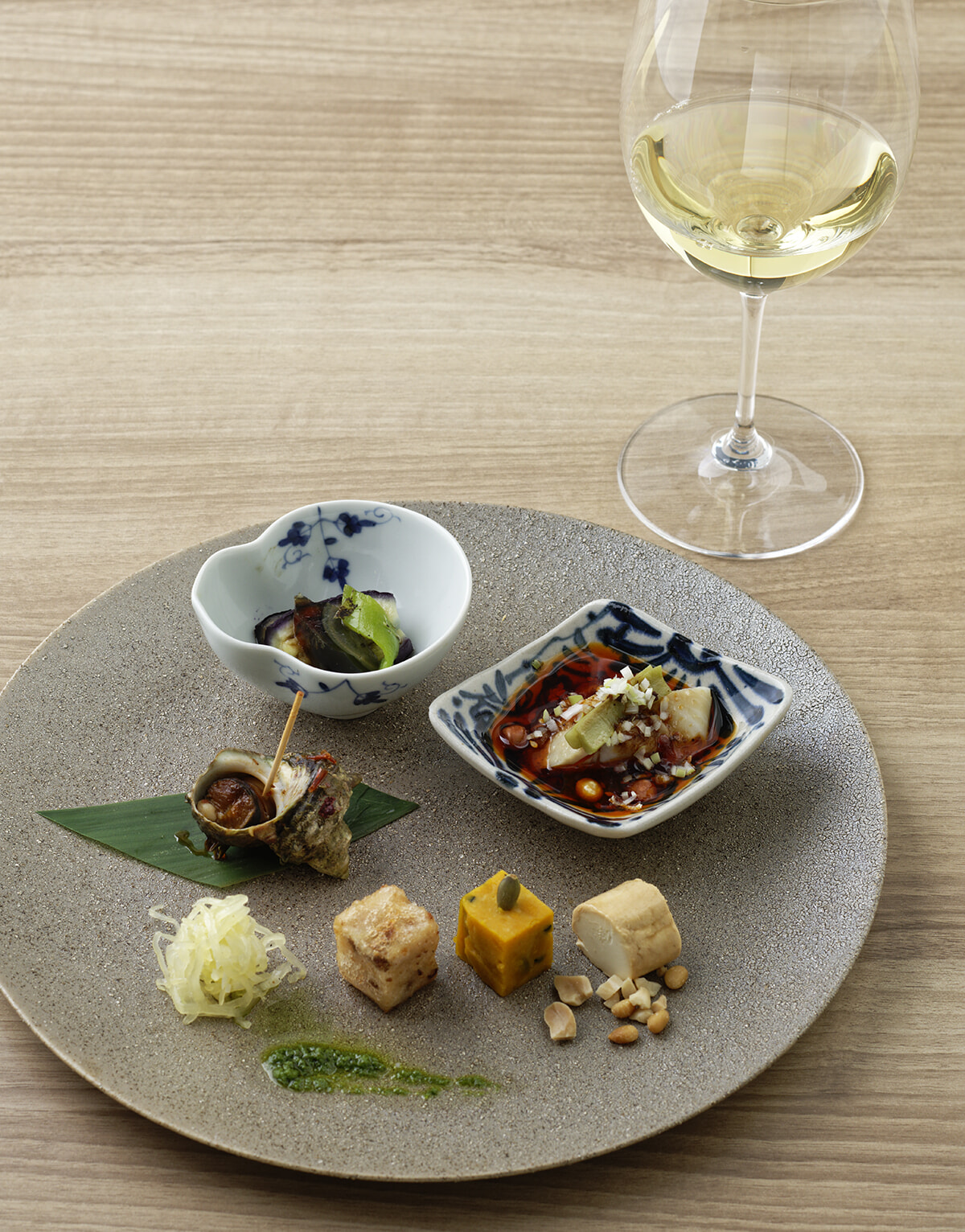 締めのおこげご飯まで、計8皿が登場する¥13,200のコースより「季節の前菜盛り合わせ」。揚げダイコン餅のネギ山椒ソース、カボチャと塩漬け卵の寄せものなど手間をかけた前菜と、日本ワインの優しい風味が重なる。グラスワインは¥1,200〜