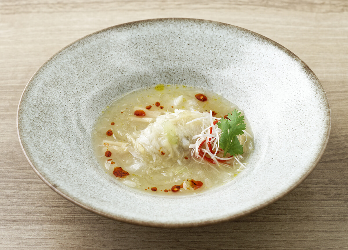 ¥13,200のコースより「季節のフカヒレスープ」。季節の食材を使い、酸辣湯仕立てで。黒酢の香りが鼻腔をくすぐり食欲をそそる。
