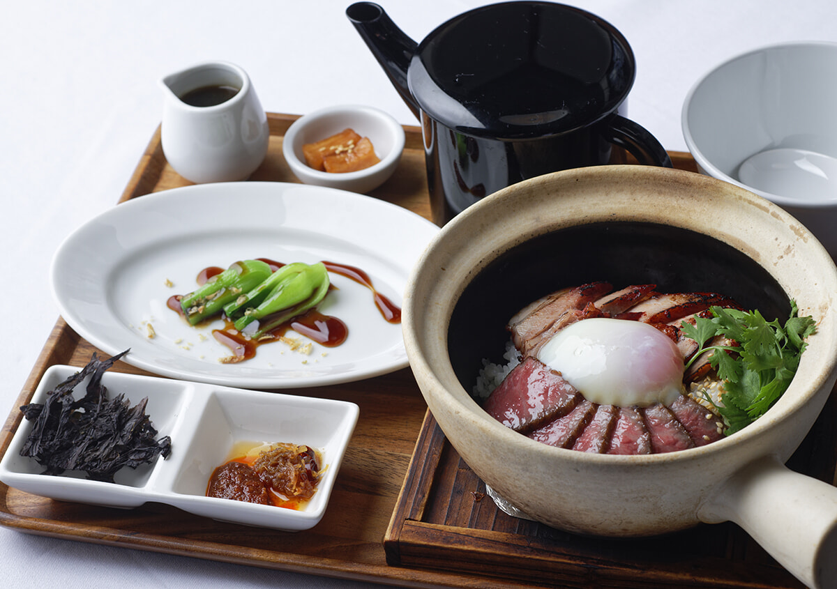 「特製和牛と蜜焼き叉焼の香港ひつまぶし土鍋ご飯 金華ハムの上湯スープ」¥2,500(ランチ10食限定)。まずは香港土鍋醤油タレを加え、次に紹興酒漬け卵と自家製XO醤をご飯に混ぜて、仕上げは金華ハムの上海スープを加えて3段階で楽しむスタイル。