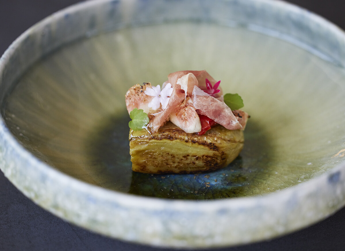 揚げナスに無農薬イチジク、ドライトマト、黒毛豚のプロシュートとヘーゼルナッツのペーストをのせた前菜。