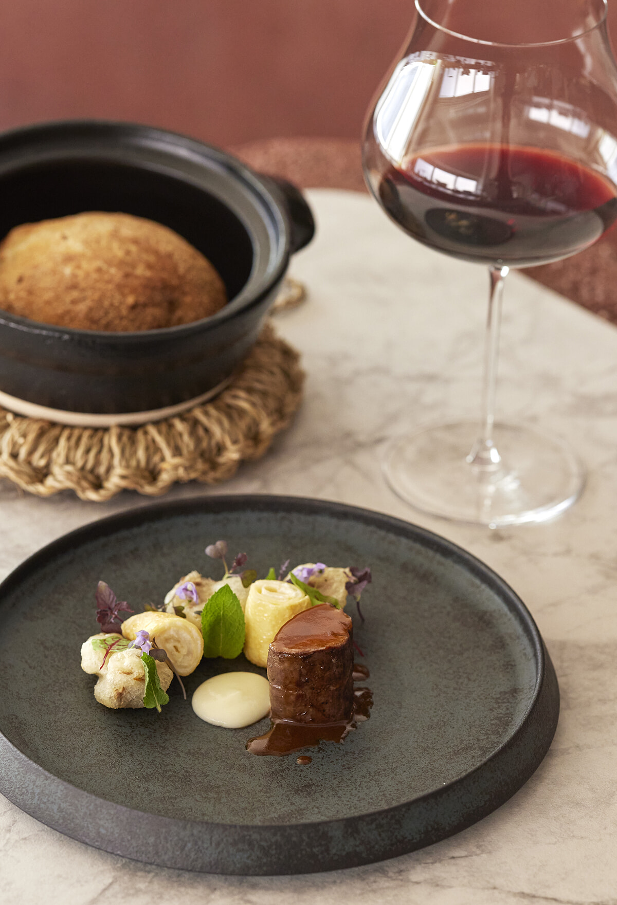 「蝦夷鹿ヒレロースト」は鹿のフォンソース、リコッタとレモンのクレープ、ポルチーニ茸のフリットを添えて。パンは2種の国産小麦を使い、土鍋で焼きたてを提供。グラスワイン¥1,210~、ワインペアリング¥7,700〜、ノンアルコールペアリング¥3,300〜