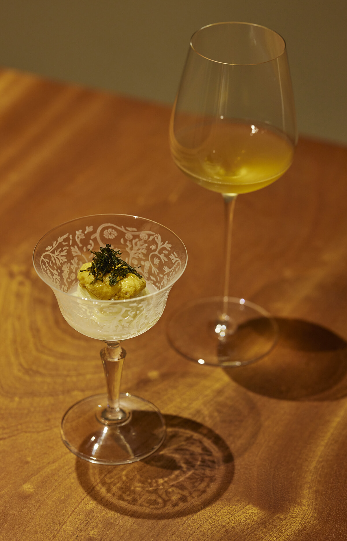 料理はいずれも¥16,500のおまかせコースより。香り豊かな佐賀産の海苔をのせた「ウニのカッペリーニ」。昆布出汁、ハマグリ出汁、コラトゥーラ(魚醬)を含ませたパスタは、オレンジワインや日本酒と好相性。ワインペアリングは6杯¥7,700~