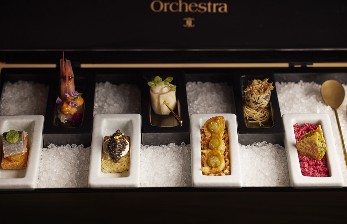 料理は全10品で¥16,500のコースより。ピアノの鍵盤に見立てたうつわで供するアミューズ「お楽しみ7種」。旬の素材を用いて7つの音色を表現した。