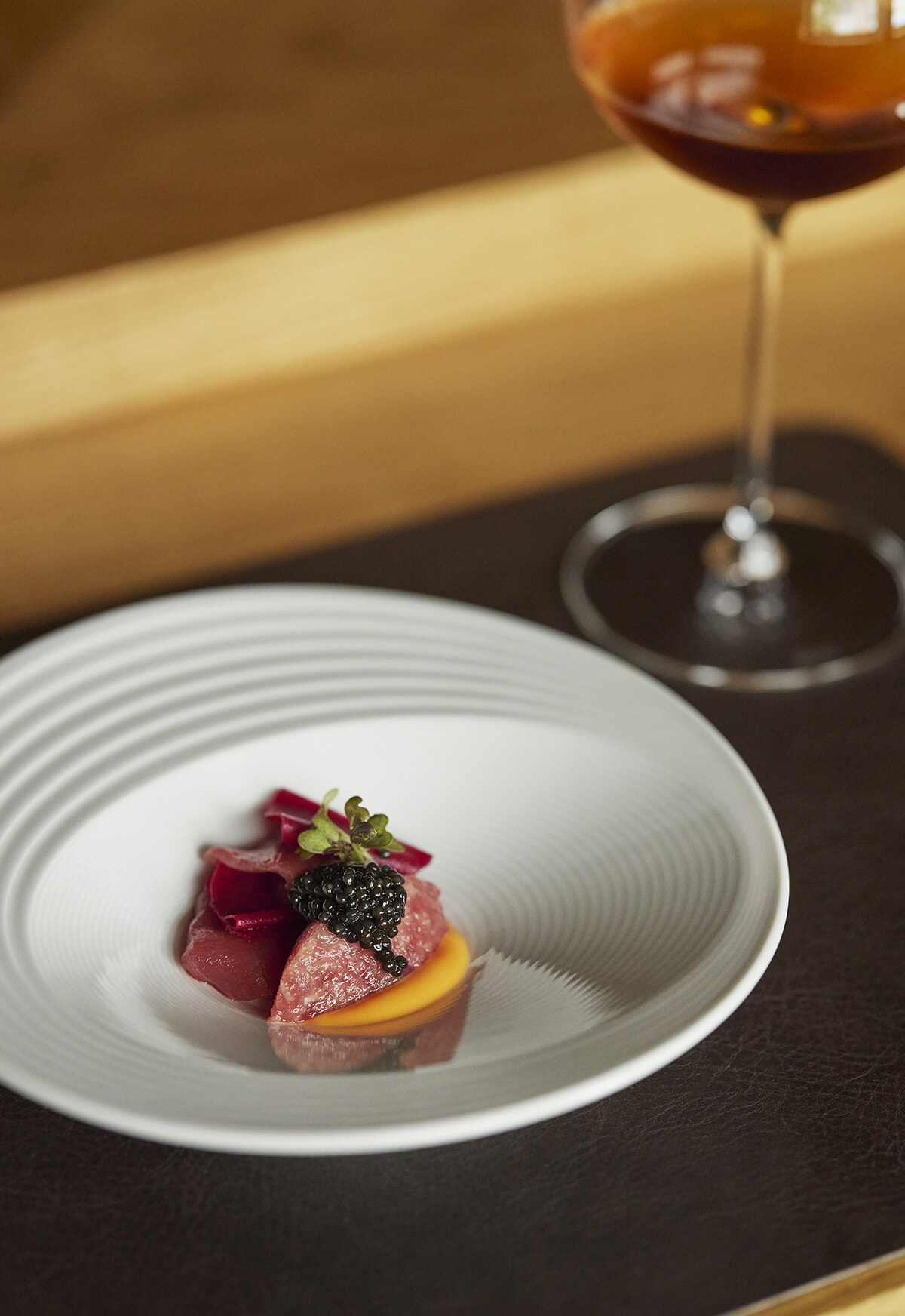 「マグロとフランス産キャビア」はマグロの”かき身”とヅケにトマトソースを添え、キャビアとビーツのピクルスをのせた前菜。おすすめのワインはシチリアの「エトナ・ロッソ」。ワインペアリング7種¥8,800~。20時30分以降はアラカルトで提供する。