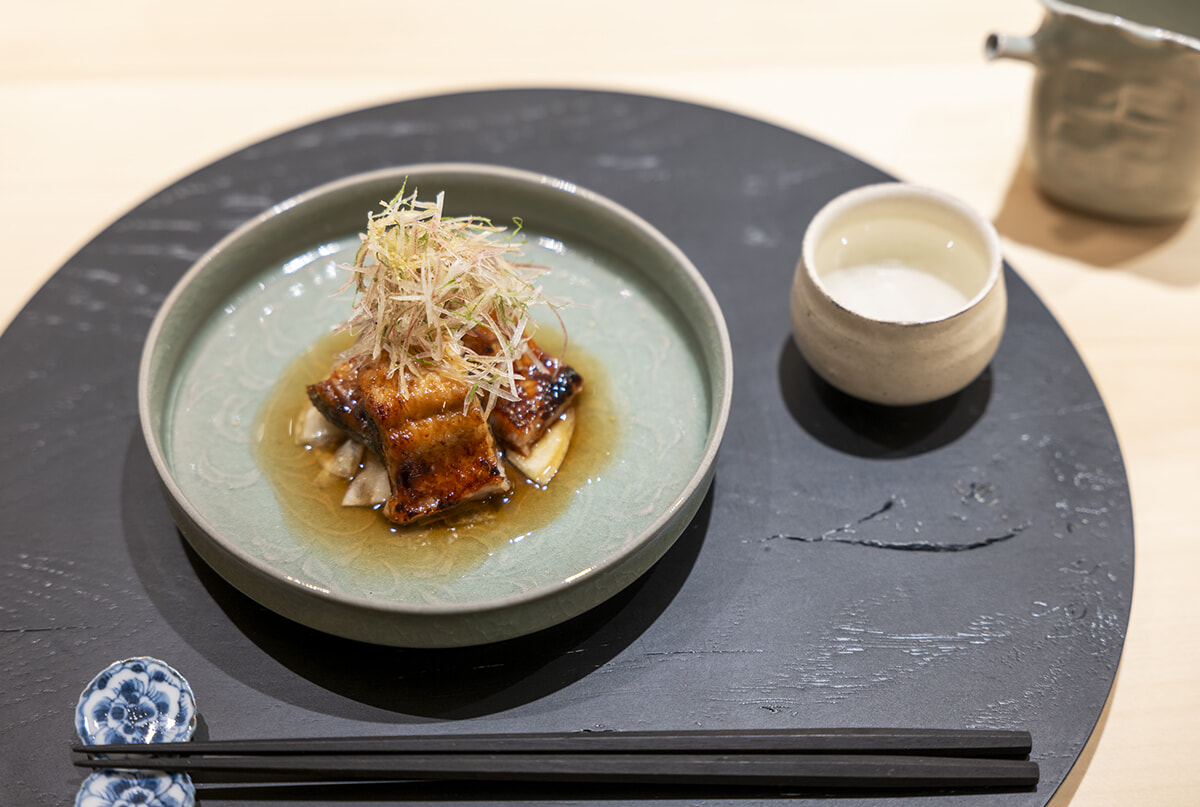 料理はいずれも¥16,500のコースから。うざくに使ったウナギは店主の地元・宍道湖の天然もの。皮をパリパリに焼き、薬味と加減酢、追い出汁で和えた。日本酒は島根の「王禄」などを揃える。1合¥1,320~