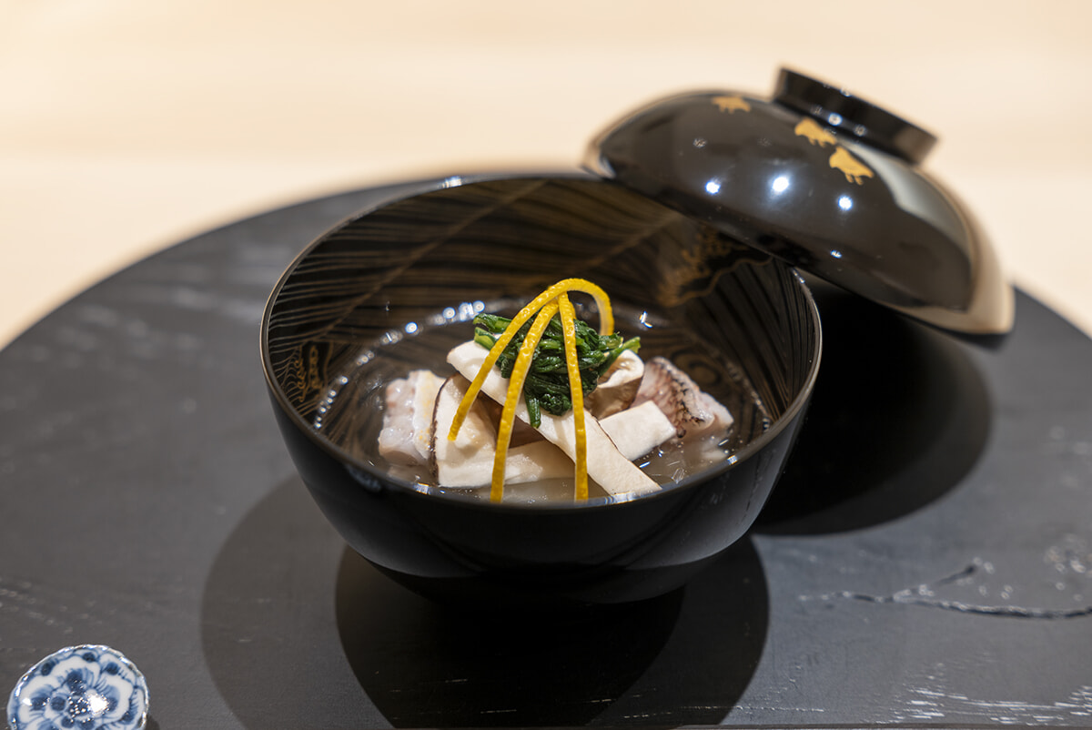 アマダイとマツタケのお椀。アマダイは酒蒸しにして椀種に。昆布は福井・敦賀の奥井海生堂、カツオ節は東京・本郷の鵜飼商店と、出汁への思い入れも深い。