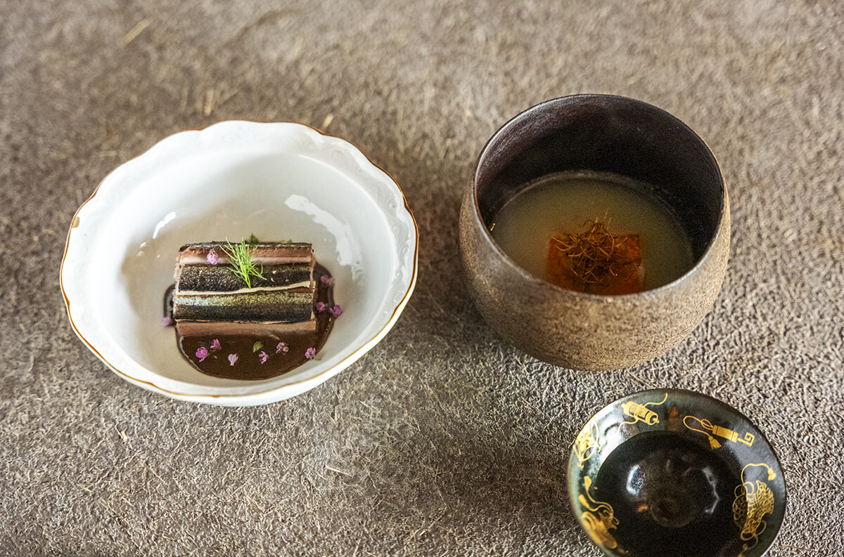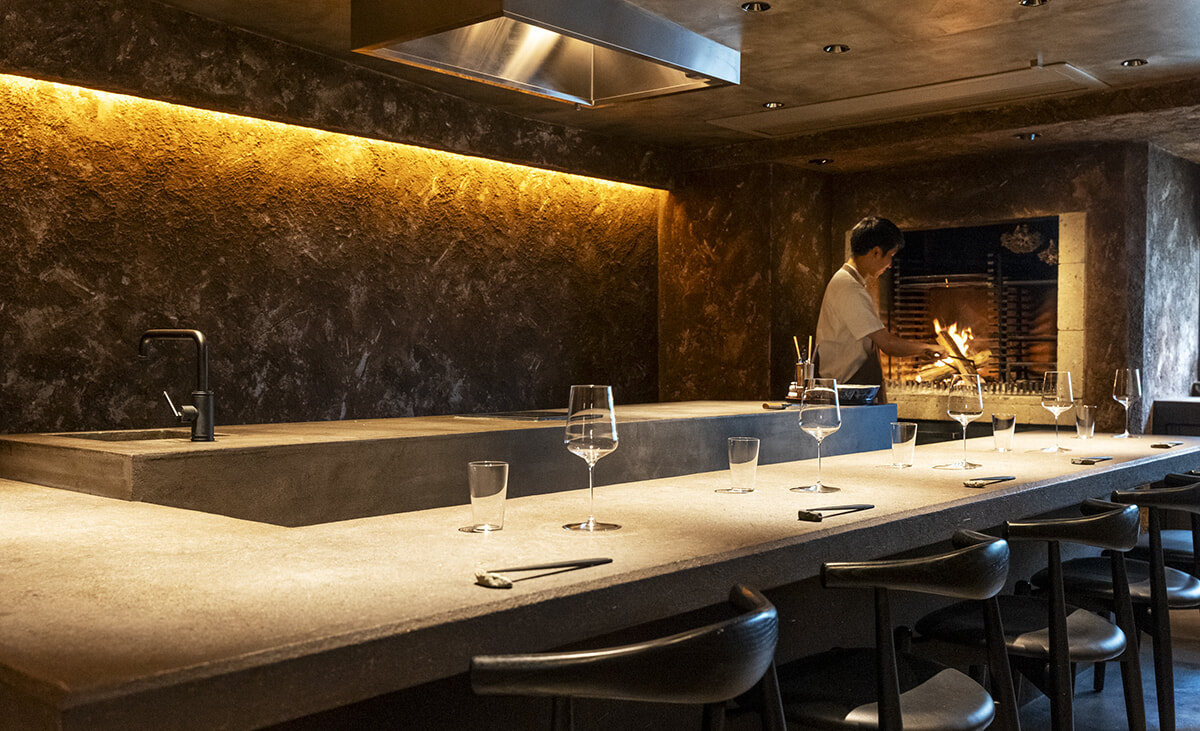 土壁に囲まれたほの暗い空間、聞こえるのはパチパチという薪火の音だけ。ここで供されるのは、発酵をテーマにした和の料理。そのほとんどが、薪火で調理される。國居優料理長は、神楽坂の懐石小室で修業した後、アルザスの領事館で公邸料理人として活躍。彼の地で薪火料理やシュークルートといった発酵料理の魅力に気付き、自身の料理に取り入れた。自家製のコンブチャや発酵果物などを活用した料理は、酸味が絶妙。清々しい食後感も印象的だ。