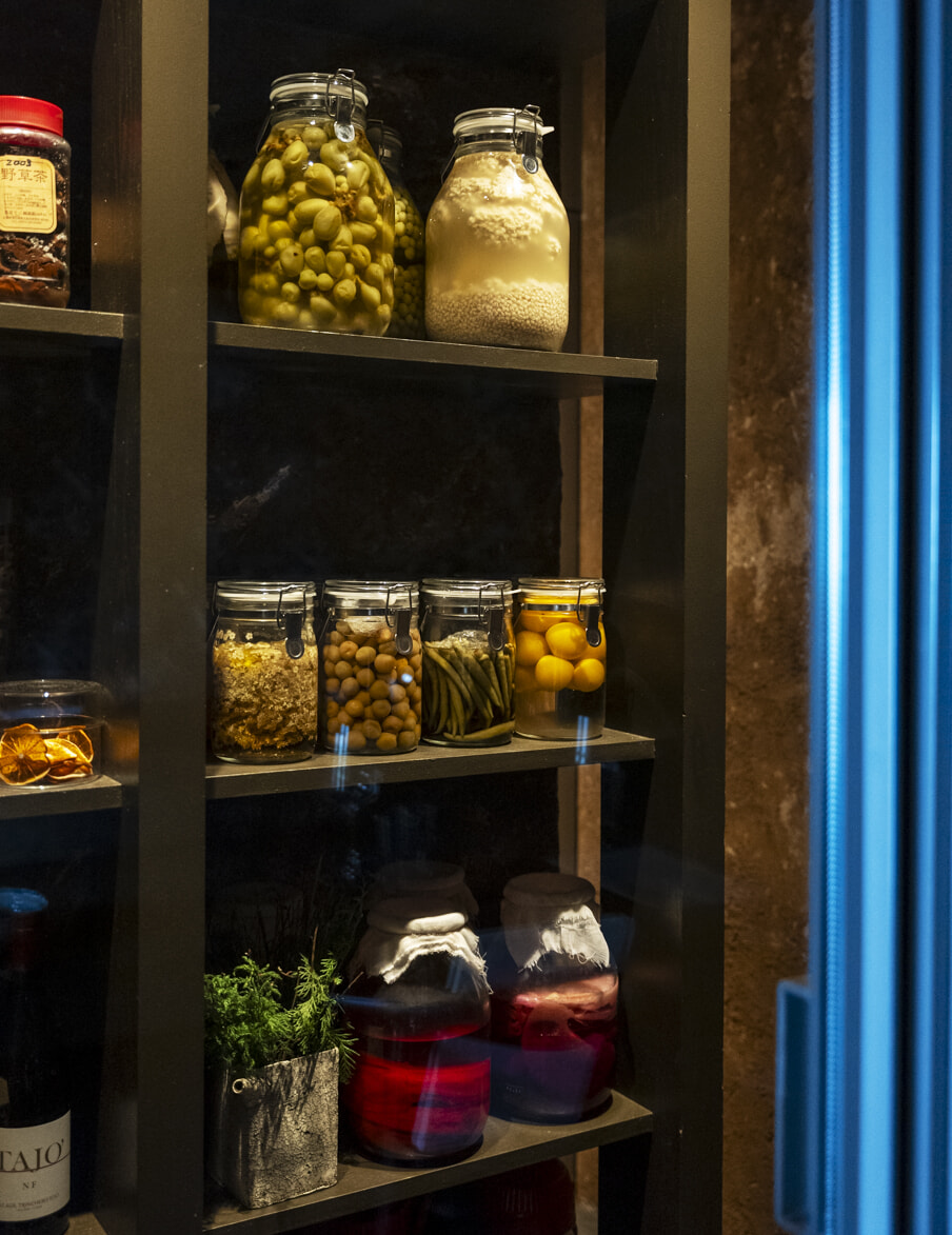 発酵棚には摘果したシャインマスカットなど、50種ほどの発酵ものが並ぶ。