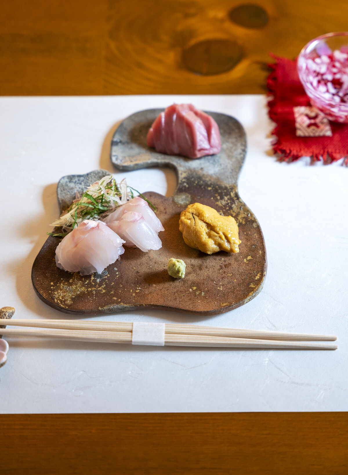 津軽金山焼の青森県形を模した皿で供する刺し身。アラと呼ばれる青森の幻の魚やキジハタ、ウニ、マグロなど日によって替わる。1人前¥1,500(写真は2人前)