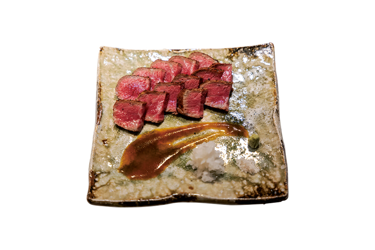 「あおもり短角牛の炭焼き」100g ¥2,500。取材時の部位はリブロース。炭とオーブンを使い分け、ゆっくりと火を通していく。リンゴを使ったほんのり果実味のあるソースと。