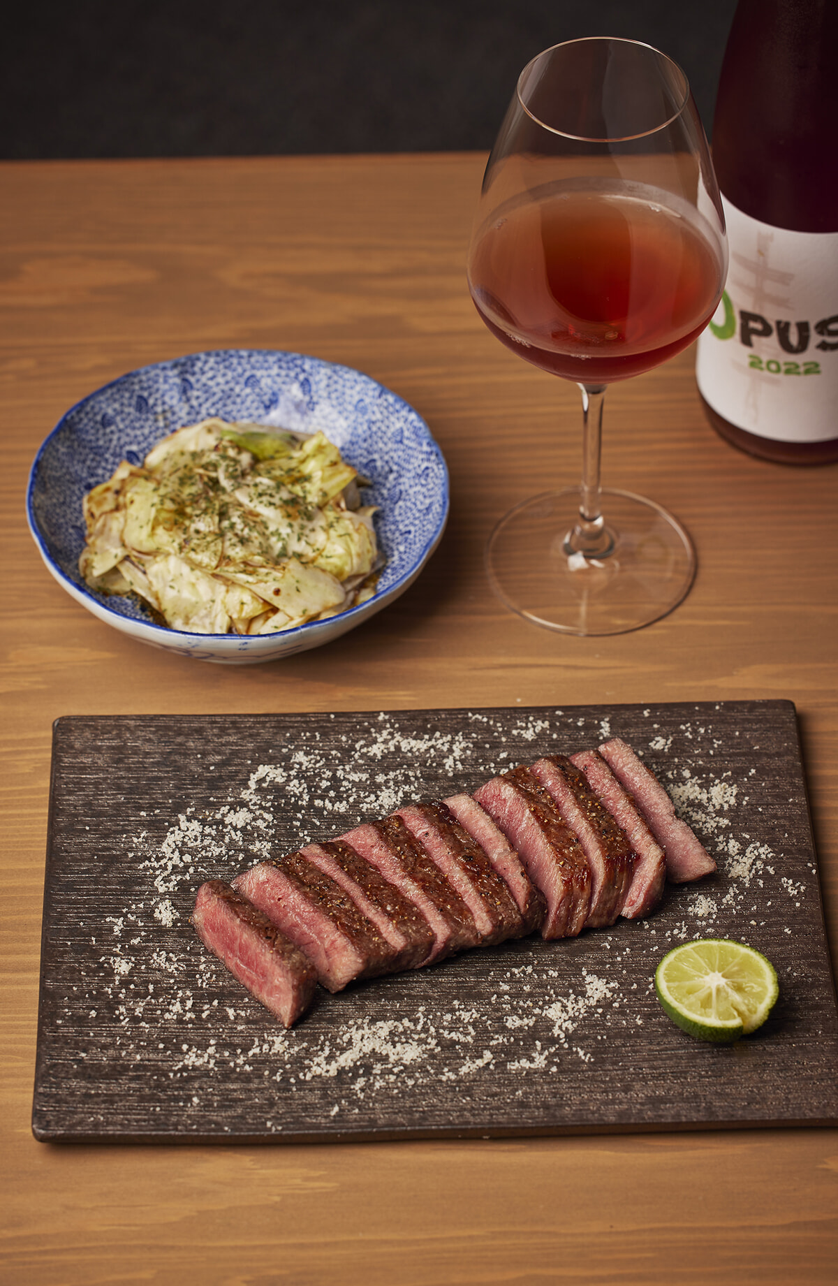 手前から、「米沢牛炭火焼き」¥4,180、「キャベツの酒盗炒め」(写真はハーフサイズ)¥385。ワインはほぼナチュール。グラス¥990~