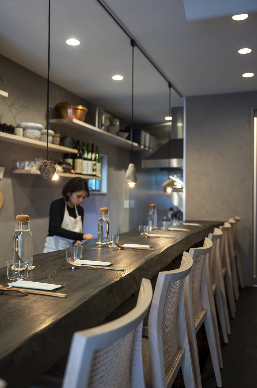 イチョウの木のカウンターが印象的な店内は、白を基調とした凛とした趣。一切の無駄を排したシンプルな内装同様、料理もいたって純朴だ。「華美なハレの料理ではなく、より上質な普段の味を突き詰めていきたい」とは三島立己店主。蔵囲利尻昆布と本枯節で丁寧にとる一番出汁など和食のセオリーは守りつつ、ウナギの蒲焼きは加賀太キュウリやミョウガと合わせてうざく風に仕立てるなどアレンジも巧み。コースは16,500円という、コスパの良さも見逃せない。