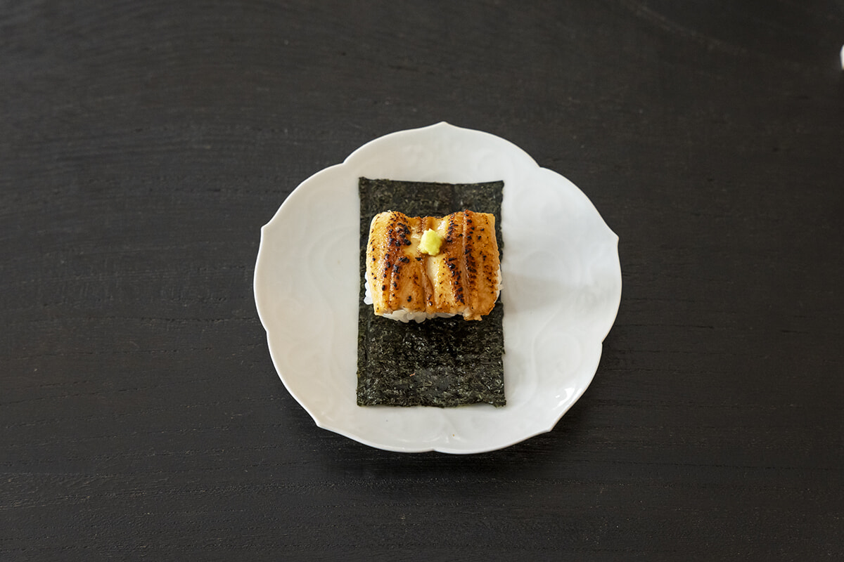 ¥7,500のコースより「煮アナゴと奈良漬けの海苔巻き」。浅草、ぬま田海苔のコクと旨味のある海苔が、ふっくらした煮アナゴとご飯にマッチ。