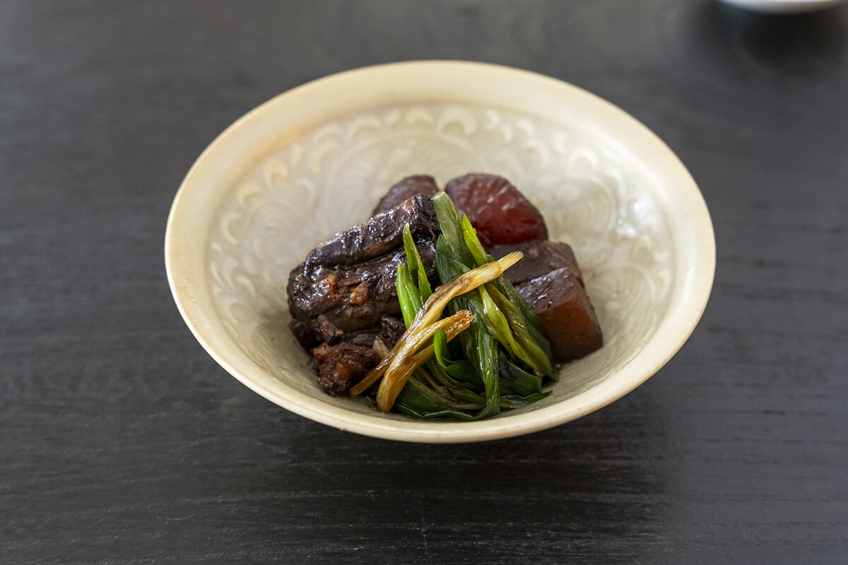 たまり醤油と古酒みりんなどで煮た柔らかな「牛テールとダイコンの煮込み」は、コースにプラス¥500