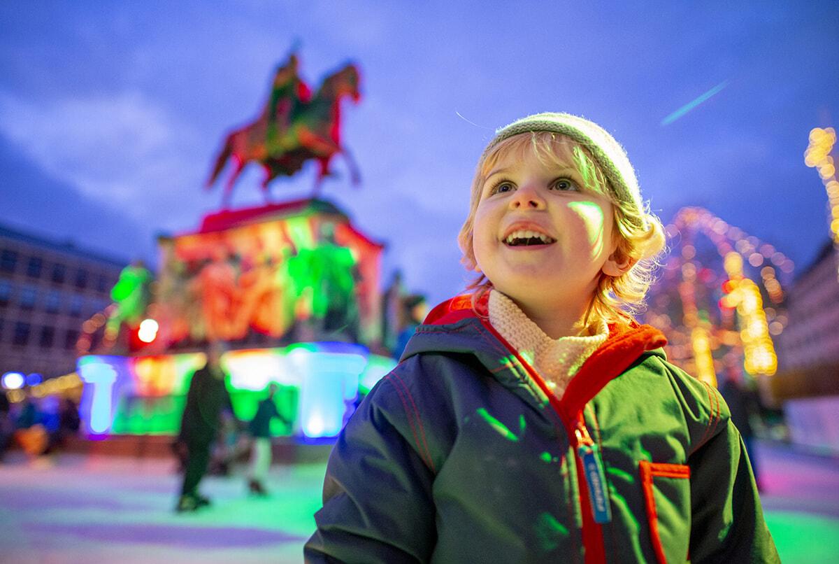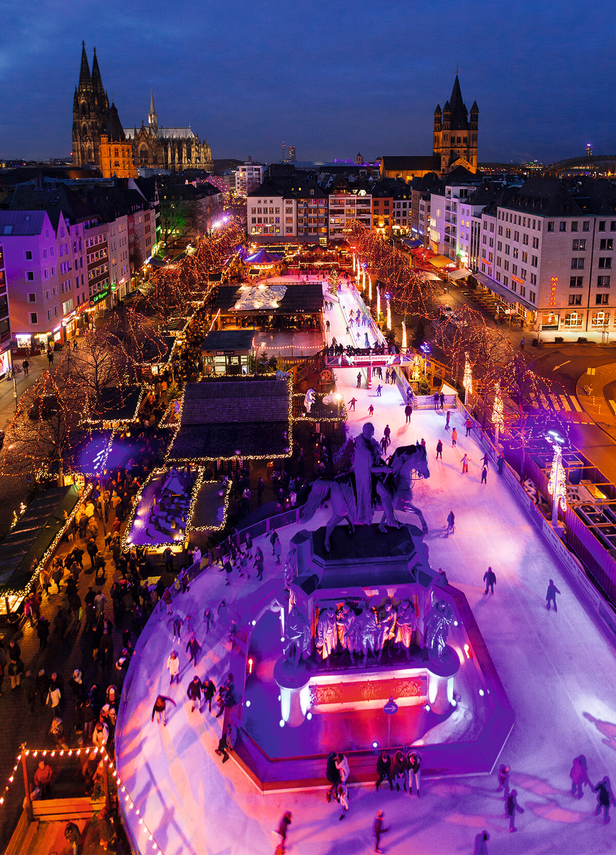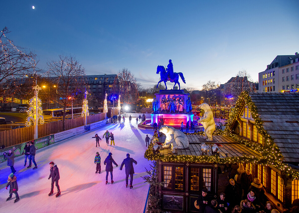 プロイセン王フリードリヒ・ヴィルヘルム3世の騎馬像を囲むスケートリンク。photography: Heinzels Wintermärchen Köln