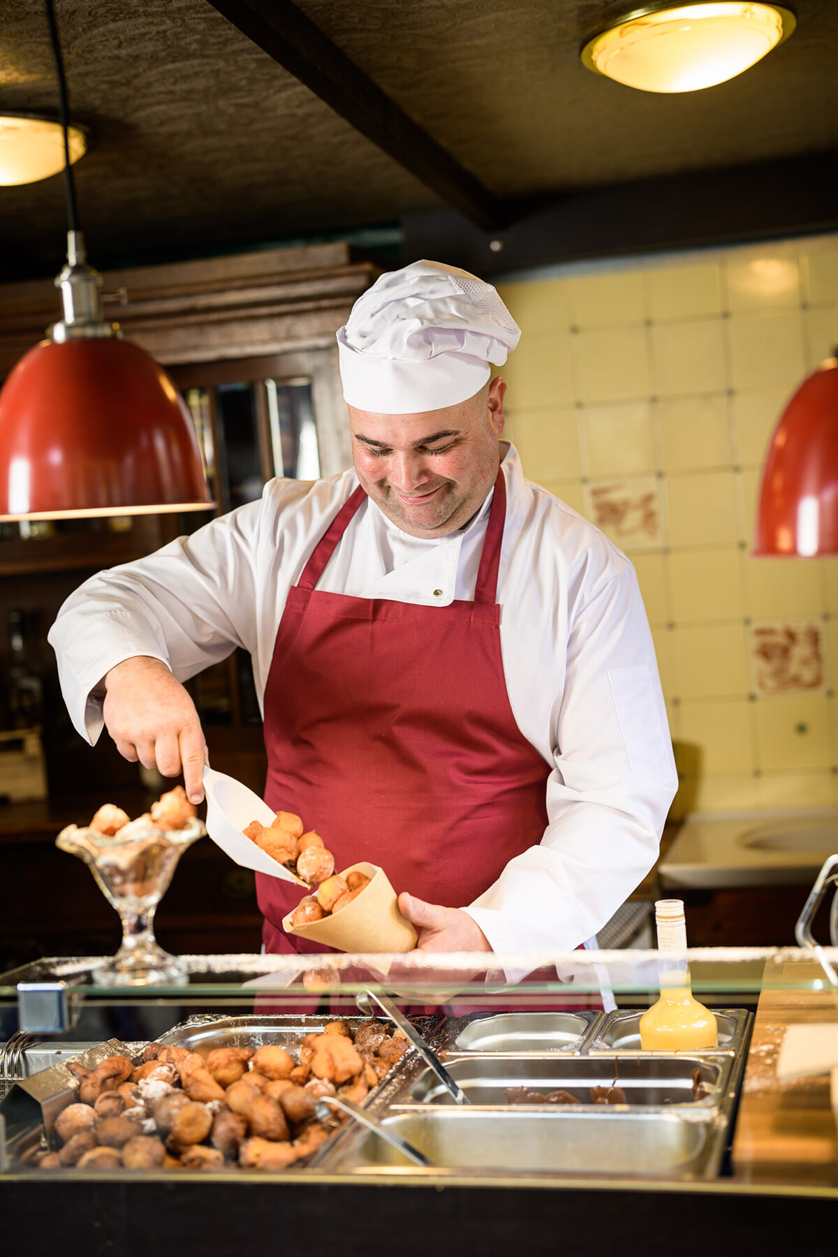 熱々のミニドーナツ、ムーツェンは、人気のクリスマスマーケットフードのひとつ。photography: Heinzels Wintermärchen Köln