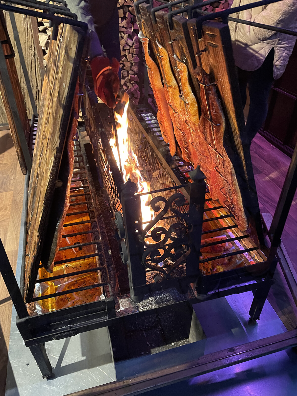 杉板に打ちつけた鮭を炭火で焼く”フラムラックス”。photography: Hideko Kawachi