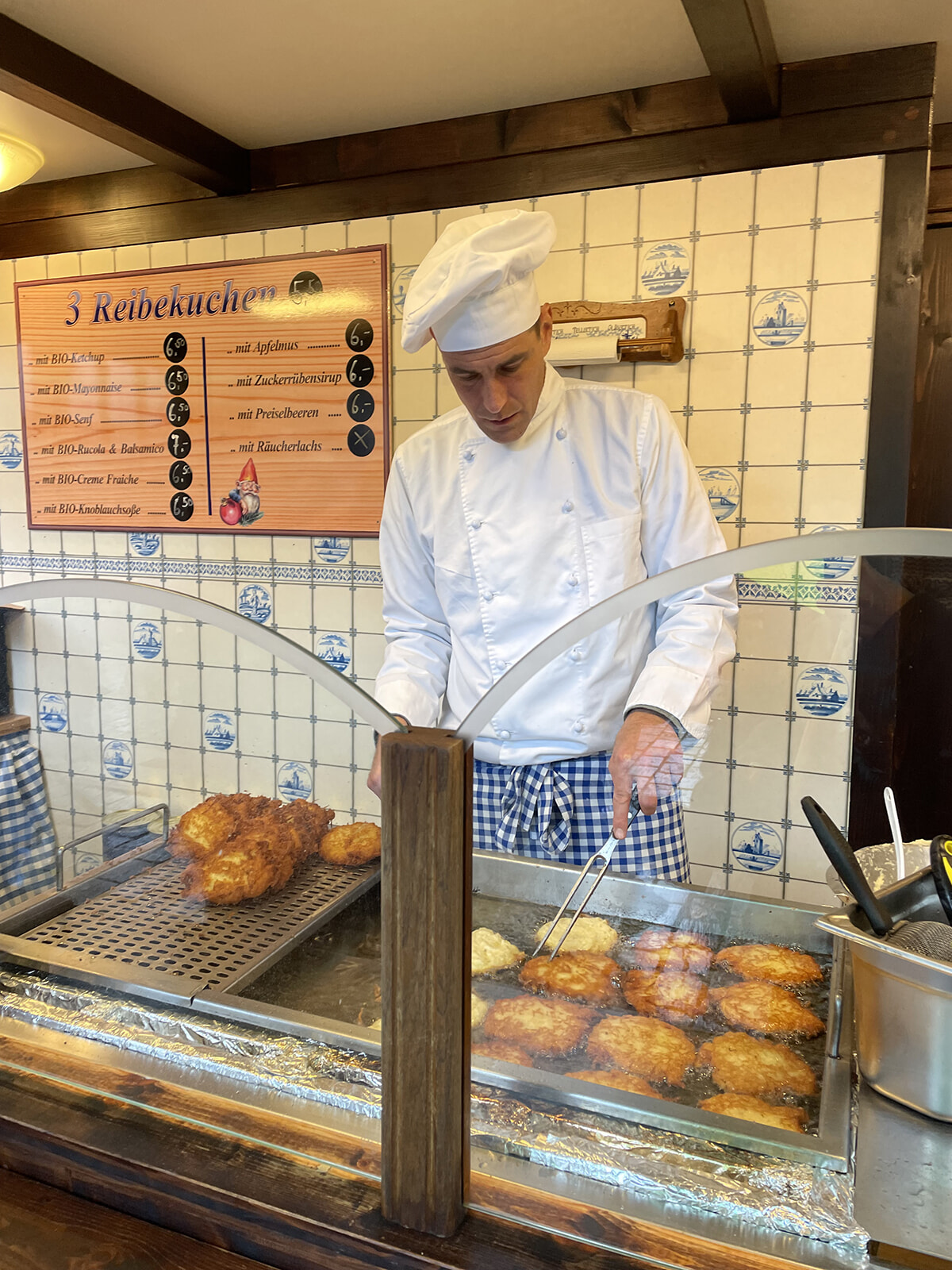 零下の気温に体が冷えたら、”フォイヤーツァンゲンボウレ”を頼みたい。熱々のホットワインの上に強い蒸留酒を染み込ませた砂糖を乗せて着火する、ホットワインのフランベ!青い炎が消えたところで飲むと、熱とアルコールでお腹の中から燃えるようだ。