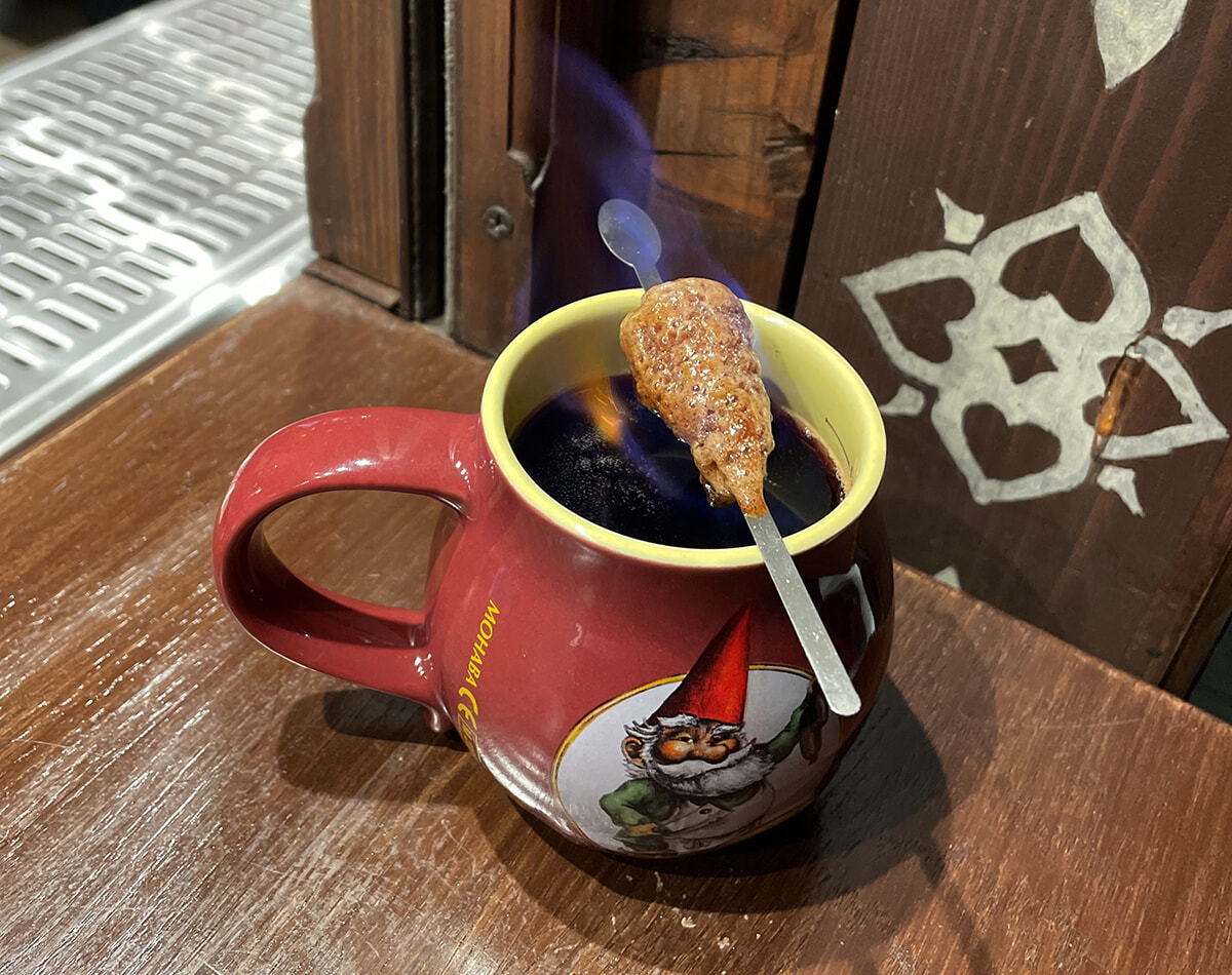 ラム酒やウォッカなど強いお酒を砂糖に染み込ませて火をつける、”フォイヤーツァンゲンボウレ”は人気のドリンク。photography: Hideko Kawachi