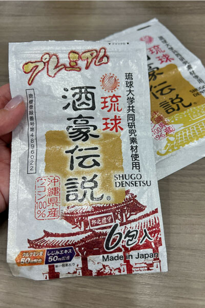 沖縄県保健食品開発協同組合と琉球大学医学部が共同開発したという「琉球酒豪伝説」を飲みます。沖縄出身の友人に紹介してもらい常備するようになりましたが、最近は都内のドラッグストアでも手に入るようになりました。4種類のウコンとしじみエキスを配合した「プレミアム」は見つけたら即買い。小さな粒状で、匂いもないので飲みやすくて気に入っています。飲む2、30分前に服用すると、酔うスピードが遅くなる&深酒の翌朝のダメージが軽減される気がしています。
