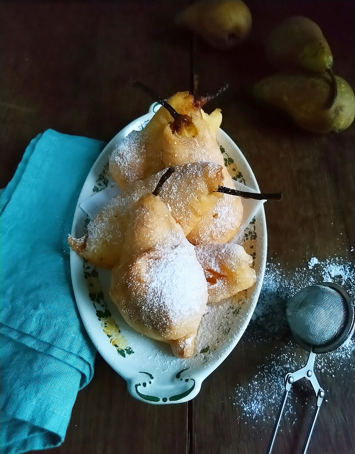 丸いもの、楕円形とベニエの形は地方や家庭によってさまざまですが、今日はマルシェで見つけた小ぶりな梨を使ってみました。